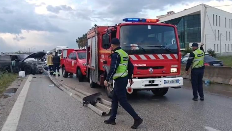Zjarrfikësit kanë mbërritur në vendngjarje për të shuar flakët dhe për të neutralizuar trafikun e krijuar.