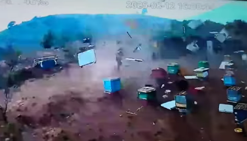 Në pamjet e sigurisë, dallohet një erë me intensitet ekstrem, me lëvizje që i ngjajnë një mini-tornadoje, e cila shkatërron tërësisht disa kosha bletësh të vendosura pranë një prone private.