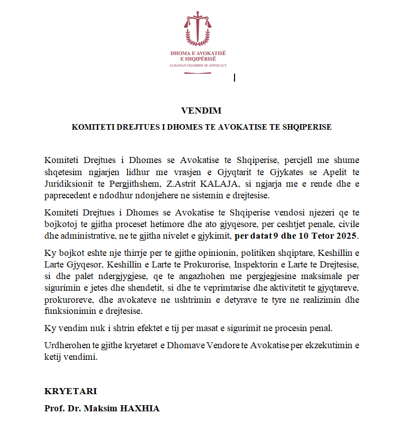 Në një deklaratë zyrtare, Komiteti e cilëson këtë ngjarje si “më të rëndën dhe të paprecedentë që ka ndodhur ndonjëherë në sistemin e drejtësisë në vend”. Si reagim ndaj kësaj ngjarjeje tragjike dhe për të ngritur zërin për sigurinë e aktorëve të drejtësisë, Dhoma e Avokatisë ka vendosur bojkot kombëtar të të gjitha proceseve gjyqësore dhe hetimore, përfshirë ato penale, civile dhe administrative, në datat 9 dhe 10 Tetor 2025.