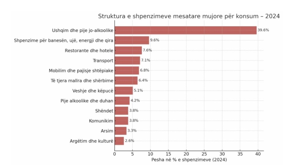 Familjet shqiptare shpenzojnë pothuajse 40% të buxhetit mujor për ushqim dhe pije jo-alkoolike, ose 36.879 lekë në muaj. Ky grup ruan të njëjtën peshë si një vit më parë, duke treguar se pjesa më e madhe e të ardhurave vazhdon të shkojë për nevojat bazë.