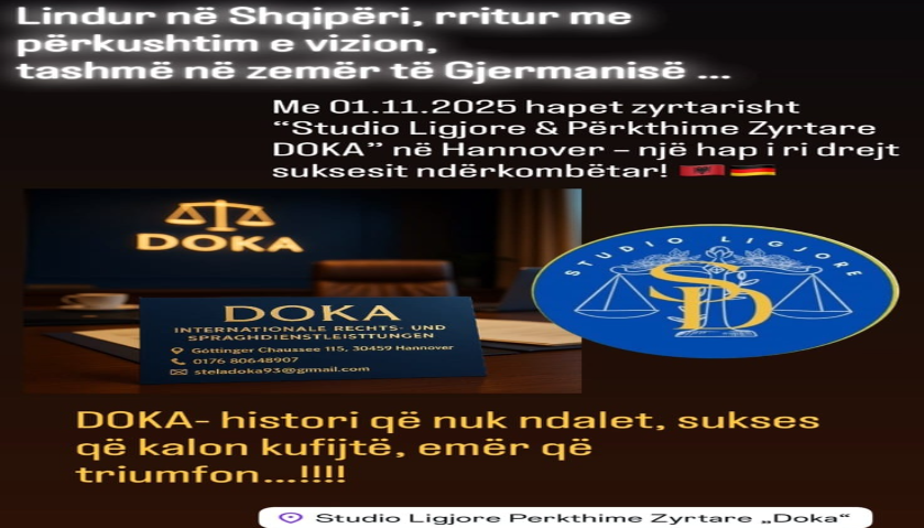 Pas shumë vitesh pune, përkushtimi dhe profesionalizmi në Shqipëri dhe “Studio Ligjore & Përkthime Zyrtare DOKA” zgjeron tashmë aktivitetin e saj edhe në Hannover, Gjermani, duke hapur zyrtarisht dyert më 1 nëntor 2025.