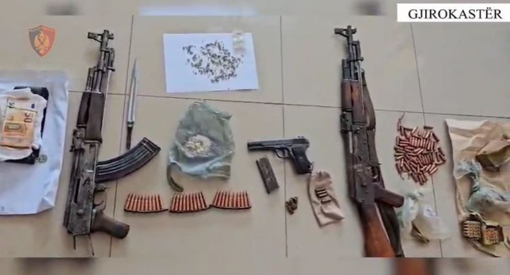DVP Gjirokastër/Sekuestrohen 3 armë zjarri, 1 armë gjahu, 1 armë e ftohtë bajonetë, municion luftarak, një sasi heroine, 300 fara kanabisi dhe një shumë parash(euro e lekë).
