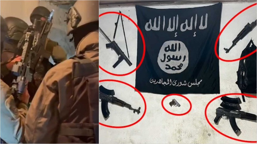 Në video duken disa armë të varura në mure dhe një flamur i zi me shkrim arab.