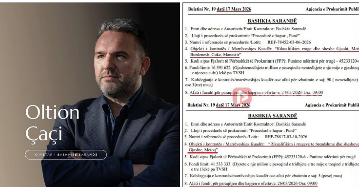 Në Buletinin e Prokurimeve Publike të datës 17 mars 2026, Kryetari i Bashkisë së Sarandës, Oltion Çaçi, ka shpallur dy tenderë, me objekt të njëjtë investimesh, “Rikualifikim rrugësh dhe sheshesh”, në disa zona të kësaj bashkie.